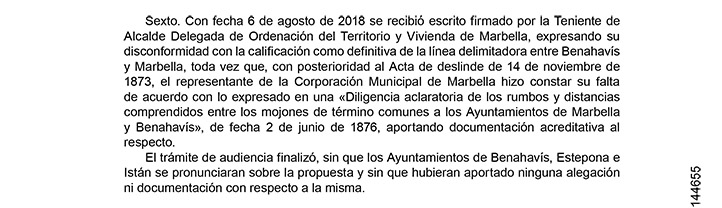 El argumento que se ofrece para ello es que con posterioridad al Acta de deslinde de 14 de noviembre de 1873, el representante de la Corporación Municipal de Marbella hizo constar su falta de acuerdo con lo expresado en una "Diligencia aclaratoria de los rumbos y distancias comprendidos entre los mojones de término comunes a los Ayuntamientos de Marbella y Benahavís", de fecha 2 de junio de 1876.