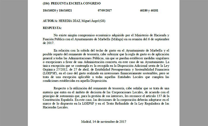 También quiere saber "si la Subdelegación del Gobierno va a impugnar los presupuestos de Marbella por incumplir la regla de gasto".